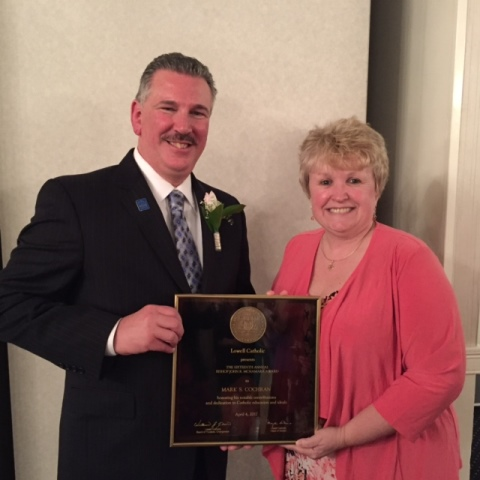 Photo: Michelle Silveira, Jeanne D’Arc Credit Union’s Senior Vice President and Chief Marketing Officer, presented the Credit Union’s President and Chief Executive Officer, Mark S. Cochran, with Lowell Catholic High School’s 16th Bishop John R. McNamara Award at a Gala held on Tuesday, April 4th at Lenzi’s in Dracut.