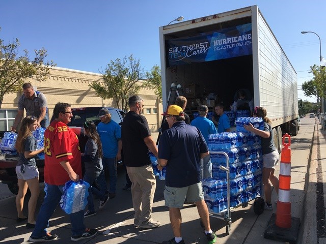 Sioux Falls, SD - On Friday September 8th, KTWB “Big Country” and five other Midwest Communications radio stations were raising money for The American Red Cross Disaster Relief Fund to support those hit hardest by the Hurricanes and flooding. To support those efforts, employees at Service First Federal Credit Union in Sioux Falls donated 93 cases of water and approximately $160 in cash. Students from Southeast Technical Institute also volunteered, accepting the donations and loading the semi-tractor trailer truck to be delivered to the Houston Food Bank.