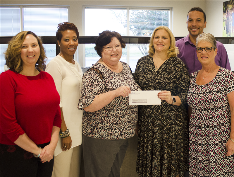 Photo: Barbara Mead with Robins Financial Credit Union along with branch staff present a check to Sherry Robinson with Heart of Georgia Hospice.