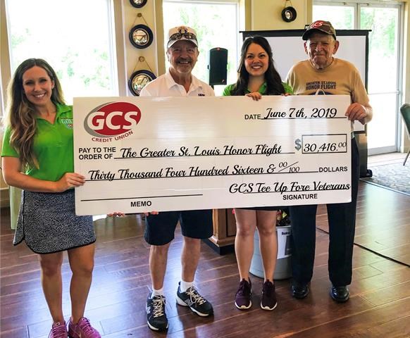 FAIRVIEW HEIGHTS, IL – GCS Credit Union representatives recently presented a check for $30,416.00 to the Greater St. Louis Honor Flight. The money was raised during GCS Credit Union’s 3rd Annual Tee Up Fore Veterans Golf Tournament at Stonewolf Golf Club in Fairview Heights. The mission of the Greater St. Louis Honor Flight is to recognize our local veterans with a day of honor, remembrance and celebration. The veterans experience a one-day, all-expenses paid trip to Washington, D.C. to visit the memorials that were built in their honor. GCS Credit Union had a goal to raise $25,000 to fly an entire plane of veterans through the Greater St. Louis Honor Flight. With the help of over 50 sponsors and 110 golfers, GCS Credit Union proudly exceeded this goal. Keith Burton, GCS Credit Union President and CEO, stated, “This is the perfect example of the credit union philosophy of “People Helping People.” I am so proud of everyone who has made it possible to raise over $25,000 three years in a row. The opportunity to fly an entire plane of our nation’s heroes is a great honor.” The Greater St. Louis Honor Flight launched in 2008 and has since safely traveled with more than 1500 local veterans. This experience is provided at zero cost to veterans. To find out more about the Greater St. Louis Honor Flight, please visit gslhonorflight.org. To find out more about GCS Credit Union, visit myGCScu.com.