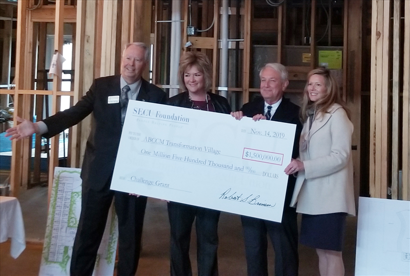 Raleigh, N.C. – SECU Foundation has announced its support for a Buncombe County initiative to help tackle the issue of homelessness for women and children. A $1.5 million challenge grant from the member-funded SECU Foundation to Asheville Buncombe Community Christian Ministry (ABCCM) will assist the non-profit with raising the remaining capital needed to complete Phase I construction of ABCCM’s Transformation Village, a 90-bed transitional housing facility and community center. A special event was held in Asheville on Thursday, with SECU Foundation Board Chair Bob Brinson delivering the announcement and presenting ABCCM officials with a ceremonial grant check. The Foundation’s grant will go directly toward finishing the community center wing, which is estimated to serve 240 women and children in the region annually.