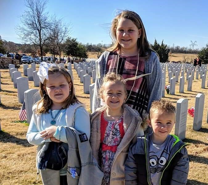 Photo caption: Pat Jackson’s grandchildren at the Dallas-Fort Worth National Cemetery where their grandfather, Navy Petty Officer Third Class Samuel K. Jackson, is buried. The Jackson family is one of several from Texas Trust that will place wreaths at military gravesites on Dec. 14 for the Wreaths Across America event.