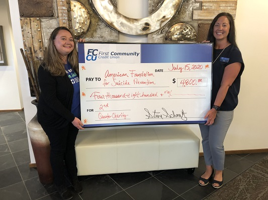 Jamestown, ND - August 5, 2020 - First Community Credit Union (FCCU) recently held fundraisers for their 2020 second quarter charity, American Foundation for Suicide Prevention (AFSP). Employees of FCCU choose a different organization each quarter to support by raising money and awareness. FCCU was able to raise $4,800 for AFSP to go towards research, education and prevention, advocacy and public policy both in North Dakota, Minnesota and nationwide.